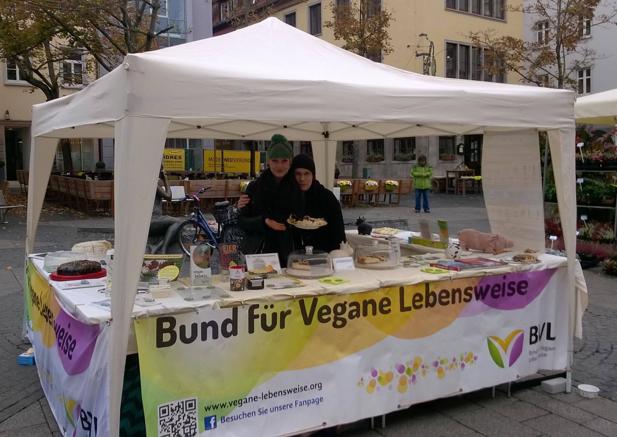 An unseren Infoständen in der Innenstadt, auf Flohmärkten und Straßenfesten informieren wir seit 2012 über die vegane Lebensweise und ihre Hintergründe und bieten Kostproben an.