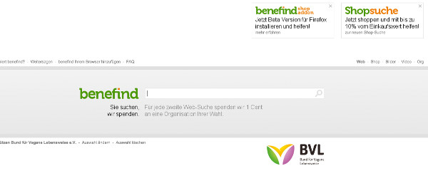 Wir alle verwenden Suchmaschinen im Alltag. Wenn Sie Benefind verwenden, erhält der Bund für Vegane Lebensweise für jede zweite Suche, die Sie durchführen, 1 Cent. Das ist nicht viel, aber wenn viele Menschen kleine Dinge tun, wird etwas Großes daraus. Weitere Informationen gibt es auf der entsprechenden Webseite benefind.de. Gehen Sie auf die org-Suche und geben Sie im Suchfeld “Bund für Vegane Lebensweise” ein. Benefind arbeitet transparent, Sie können die Spendenstatistik der verschiedenen Orgas ebenfalls einsehen.