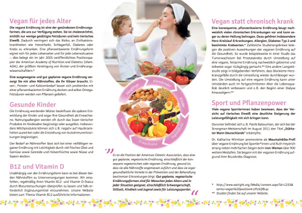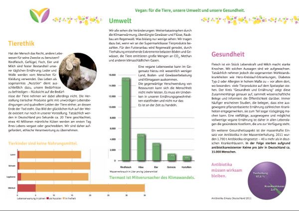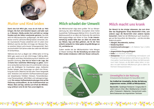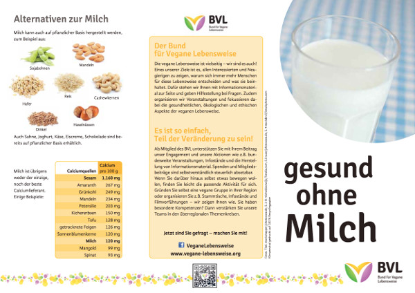 Für allgemeine Anlässe bietet sich vor allem unser Gesundheitsfaltblatt an. Unsere Kurzbroschüre zum Thema Milch stellt noch konkreter dar, warum auch die vegetarische Lebensweise nicht nur für die menschliche Gesundheit problematisch ist. Weitere Aspekte zum veganen Leben und dem BVL im Allgemeinen bringt unser “vegan leben”-Flyer nahe.