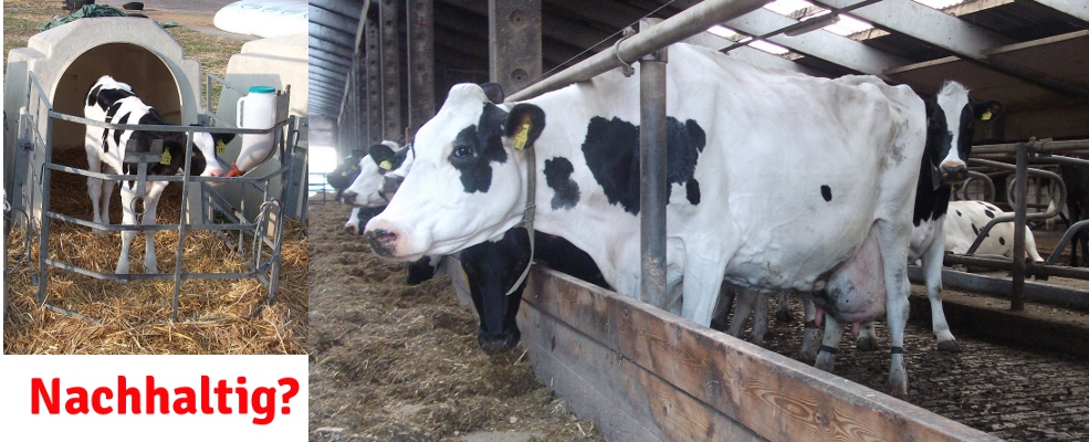 Die Kühe müssen gefüttert, ihre Futtermittel angebaut oder importiert werden. Außer einigen wenigen Biobetrieben mit sehr strengen Verbandsrichtlinien verfüttern die Milchproduzenten – das Wort Bauer ist hier meist völlig unangemessen – an die Kühe einen Großteil importiertes und teilweise genetisch verändertes Kraftfutter, damit die Milchleistung so hoch wie möglich ist. Für den Futteranbau werden in anderen Teilen der Welt täglich große Regenwaldflächen gerodet und natürlich erfordert der Transport den Einsatz von Erdöl. Gegenüber einer „normalen“ Kuh geben die heutigen Hochleistungskühe bis zu 12 Mal so viel Milch. Euterentzündungen gehören zum normalen „Tagesgeschäft“ und werden mit Antibiotika in Schach gehalten. Die Gewinnmaximierung erfordert, dass die Kühe ihr Leben meist ohne große Bewegungsmöglichkeiten in Ställen angebunden verbringen. Kurz nach der Geburt des Kalbes wird die Kuh erneut künstlich befruchtet. Nach 4-5 solcher Zyklen verringert sich meist die Milchleistung, sodass die Kuh geschlachtet und durch eine der Töchter ersetzt wird.