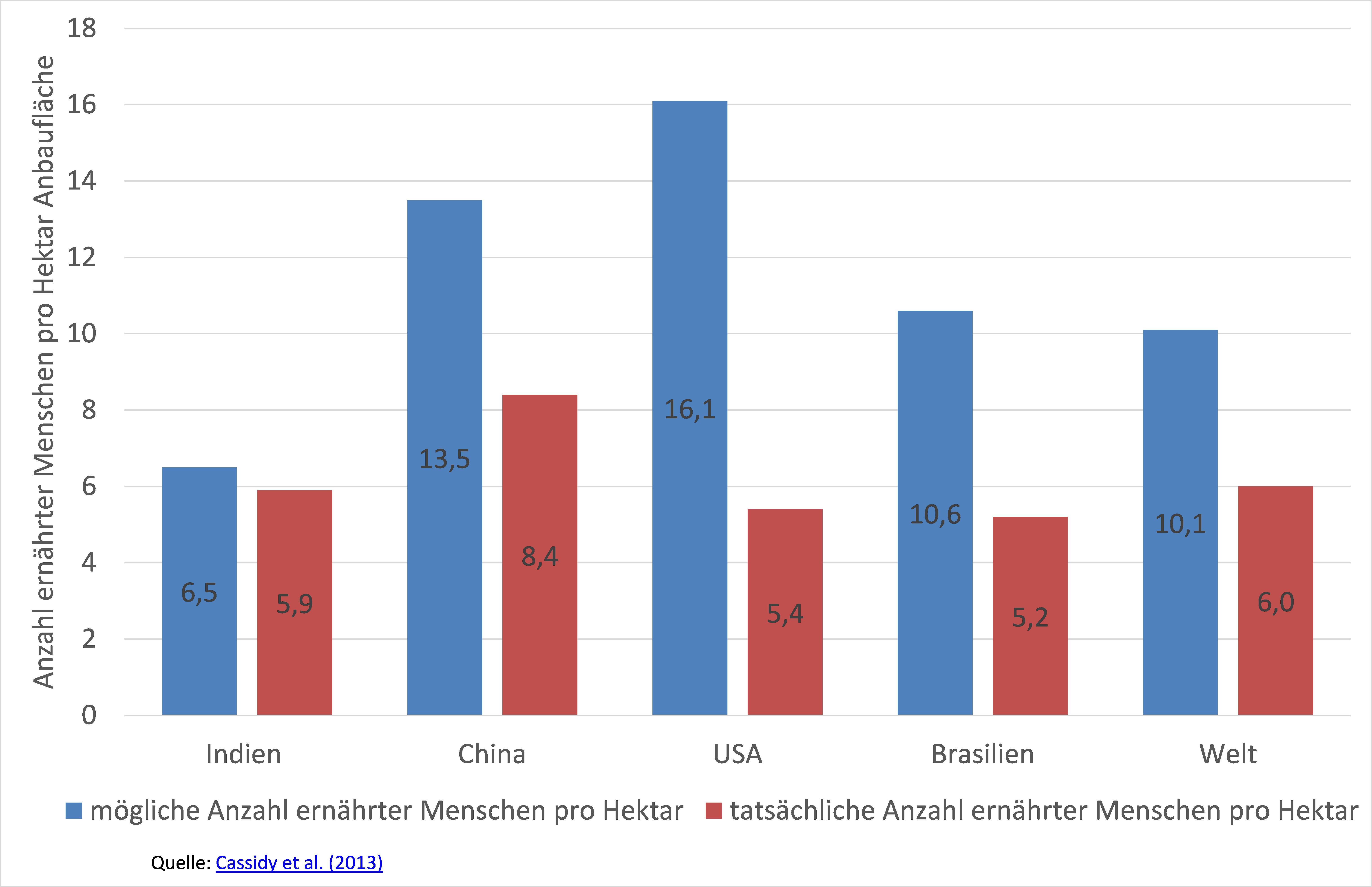 Welthunger: Würde man die gegebene Menge der Feldfrüchte (und den aktuellen Mix aus verschiedenen Feldfrüchten) ausschließlich zur Ernährung der Menschheit verwenden, könnte man die verfügbaren Gesamtmenge an Kalorien, die für die menschliche Ernährung zur Verfügung stehen, um 70% erhöhen (Cassidy et al., 2013):